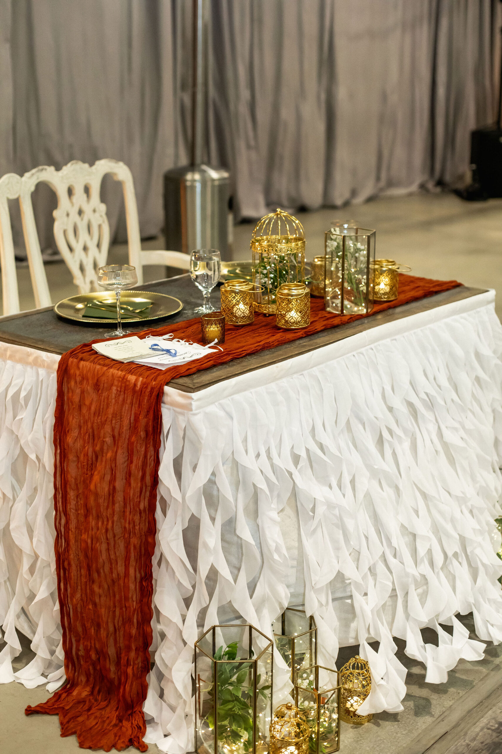 Your sweetheart table is one of the most photographed spots of the night, and our Sweetheart Table Package ensures it stands out. This package includes greenery chandeliers, terrarium globes, candle options, and linens to create a beautiful focal point for your first meal as newlyweds.