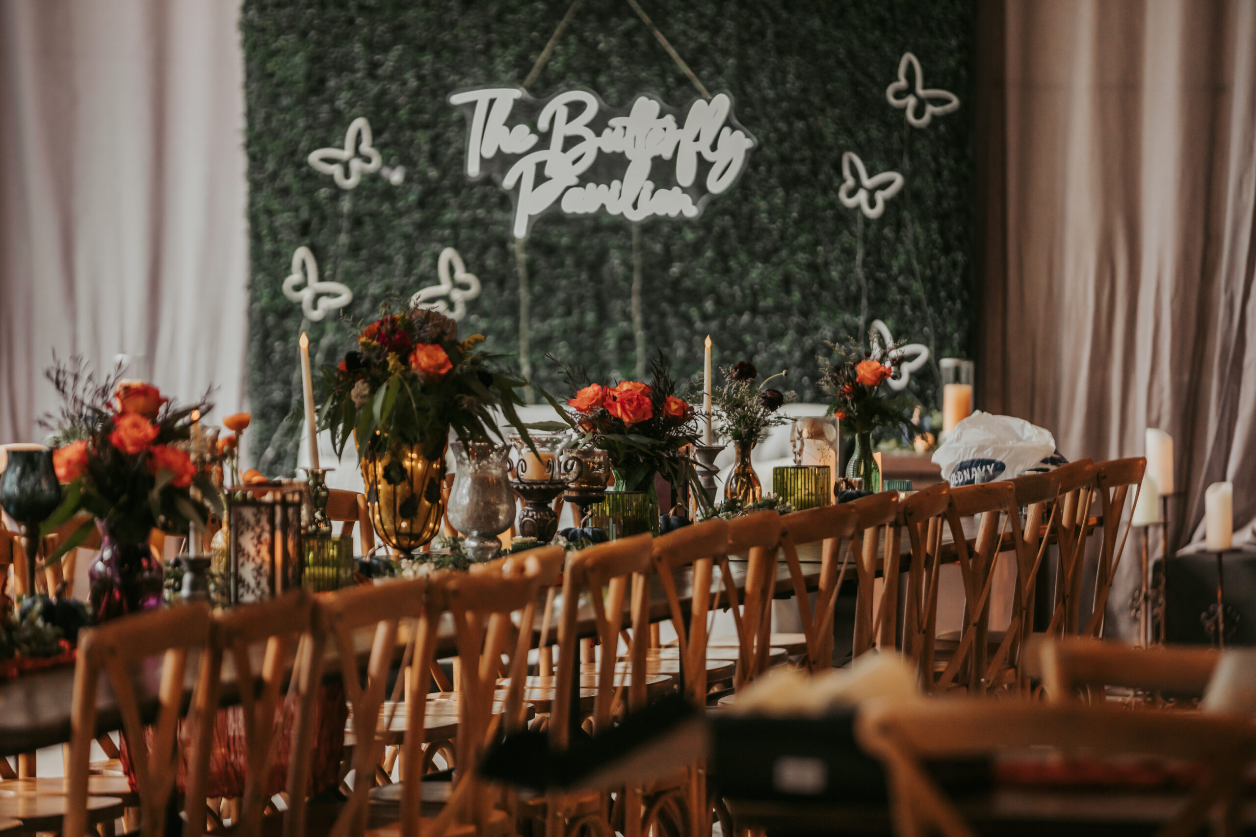Photo moments matter, and our Boxwood Greenery Wall creates the perfect backdrop. Featuring lush greenery and a neon “The Butterfly Pavilion” sign, this option gives you and your guests a designated photo spot that feels modern, fun, and Instagram-worthy. It’s ideal for cocktail hour, receptions, or as a statement piece near the dance floor.